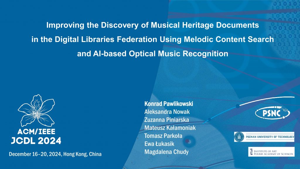 Podczas konferencji JCDL 2024 w Hongkongu (16–20 grudnia 2024 r.) pokazaliśmy efekty modernizacji Federacji Bibliotek Cyfrowych (FBC). W naszej prezentacji Improving the Discovery of Musical Heritage Documents in the Digital Libraries Federation Using Melodic Content Search and AI-based Optical Music Recognition omówiliśmy kluczowe modyfikacje systemu takie jak: 1. dostosowanie silnika Solr do przetwarzania dokumentów […]