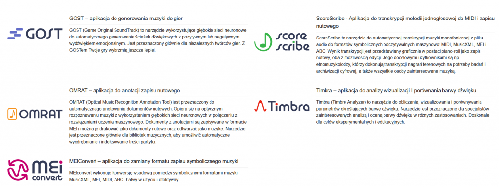 Obejmują one narzędzia do automatycznej transkrypcji nagrań utworów jednogłosowych i przedstawienia ich w postaci zapisu nutowego oraz automatycznego „odczytu” skanów zapisu nutowego z wykorzystaniem metod sztucznej inteligencji (sieci neuronowych). W obu wypadkach uzyskuje się zapis utworu w jednym z kilku formatów przeznaczonych do „maszynowej” reprezentacji muzyki – MEI, MusicXML, ABC, MIDI czy EsAC, co otwiera drogę do dalszego przetwarzania i odtwarzania utworu z wykorzystaniem szeregu innych programów muzycznych.