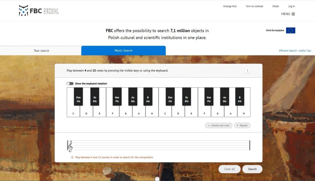 The overarching goal of these developments was to introduce full-text and melodic content search capabilities, significantly improving the discovery and content-based retrieval of more than 45,000 sheet music objects aggregated in FBC — the largest Polish aggregator of digital cultural heritage resources.